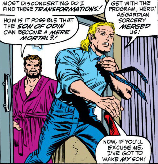 Thor now shares a body with Eric Masterson, and is roommates with Hercules. It’s very odd. And could have been hilarious. Unfortunately, Tom DeFalco is not a writer who does humor. He does melodrama.