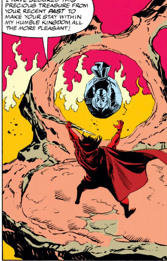 With the help of Dr. Strange, Masterson goes to Mephisto’s hell with Silver Surfer to get his stick/hammer back. He gets it back, but isn’t able to get the plastic bag with Thor in it.