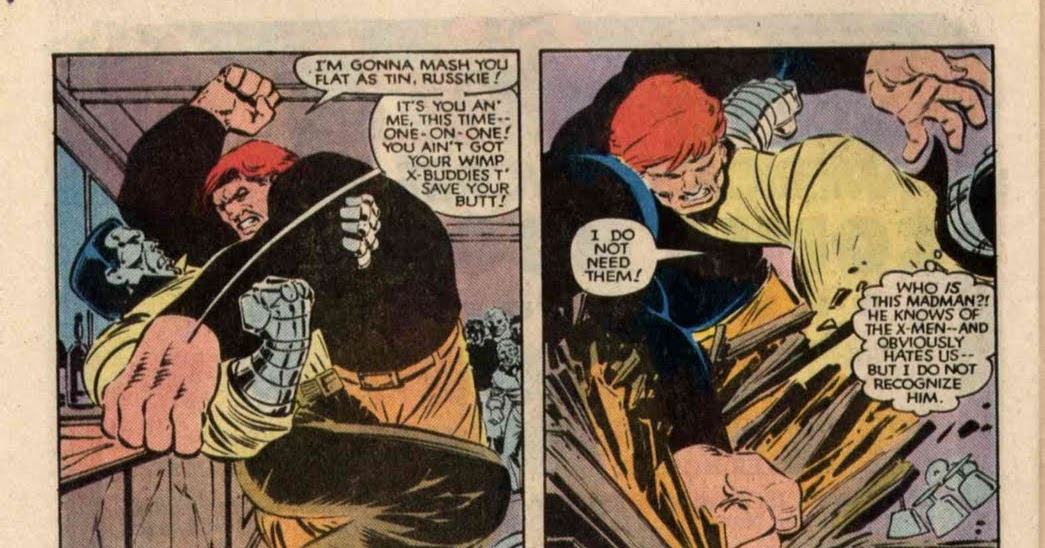 Wolverine wants to teach Pete a lesson about loyalty. Violently. So he takes Colossus to a bar, to whip his ass.
