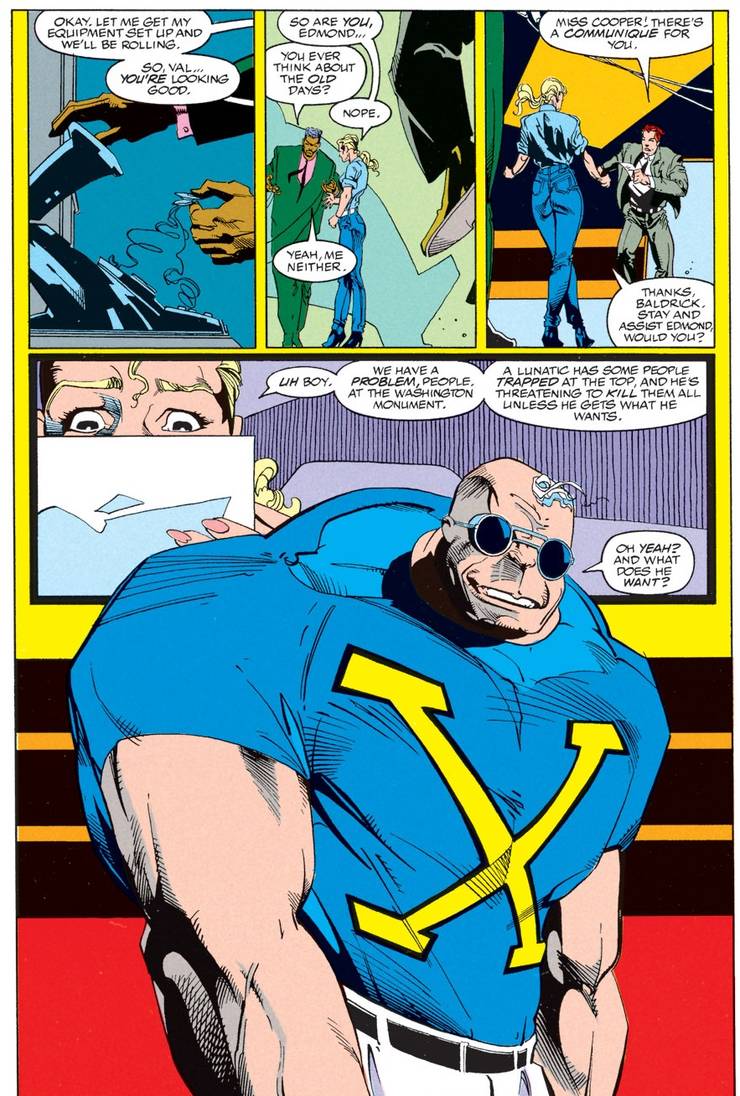 Val Cooper learns that someone has taken people hostage at the Washington Monument, and he’s demanding to fight Strong Guy.